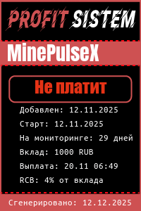 🎮 Заскочил в Новый интересный проект. Который работает как мини приложение На базе мессенджера 𝐓𝐞𝐥𝐞𝐠𝐫𝐚𝐦 📚 Информация о MinePulseX 🎯 Как это работает? 1️⃣ Регистрируйтесь в приложении 2️⃣ Активируйте майнинг одним кликом 3️⃣ Наблюдайте рост баланса в реальном времени 4️⃣ Выводите средства когда удобно 💎 Преимущества: • Без вложений - начните зарабатывать бесплатно • Мгновенные выплаты • Поддержка 24/7 - всегда готовы помочь 🎁 Бонусы: • Ежедневные задания • Колесо фортуны • Акции и конкурсы 🔸🔸🔸🔸🔸🔸🔸🔸🔸🔸🔸🔸 Предлагается зарабатывать: От 10% до 25% в сутки. Начисления прибыли каждую секунду. Вклад работает на бессрочной основе. 🔸🔸🔸🔸🔸🔸🔸🔸🔸🔸🔸🔸 Сам пополнил на 1000 RUB Доход составил 120.4 RUB в сутки Что выходит по 12.04% в сутки Популярные платежные системы Рекомендую использовать 𝗣𝗮𝘆𝗲𝗲𝗿 💸 Выплаты мгновенные, 𝐈𝐧𝐬𝐭𝐚𝐧𝐭. 💬 Есть чат в 𝐓𝐞𝐥𝐞𝐠𝐫𝐚𝐦